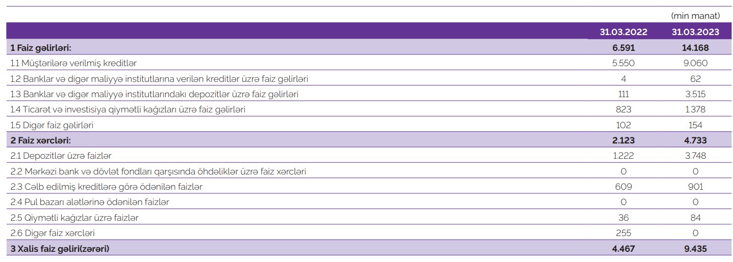 2022-ci ilin 1-ci rübü ilə müqayisədə 2023-cü ilin 1-ci rübündə "Azər-Türk Bank"da müştərilərə verilmiş kreditlər üzrə faiz gəliləri 1,6 dəfə artaraq 9 milyon 60 min manat, xarici valyutadan gəlir (məzənnə dəyişməsi daxil olmaqla) 5,5 dəfə artaraq 3 milyon 515 min manat təşkil edib.