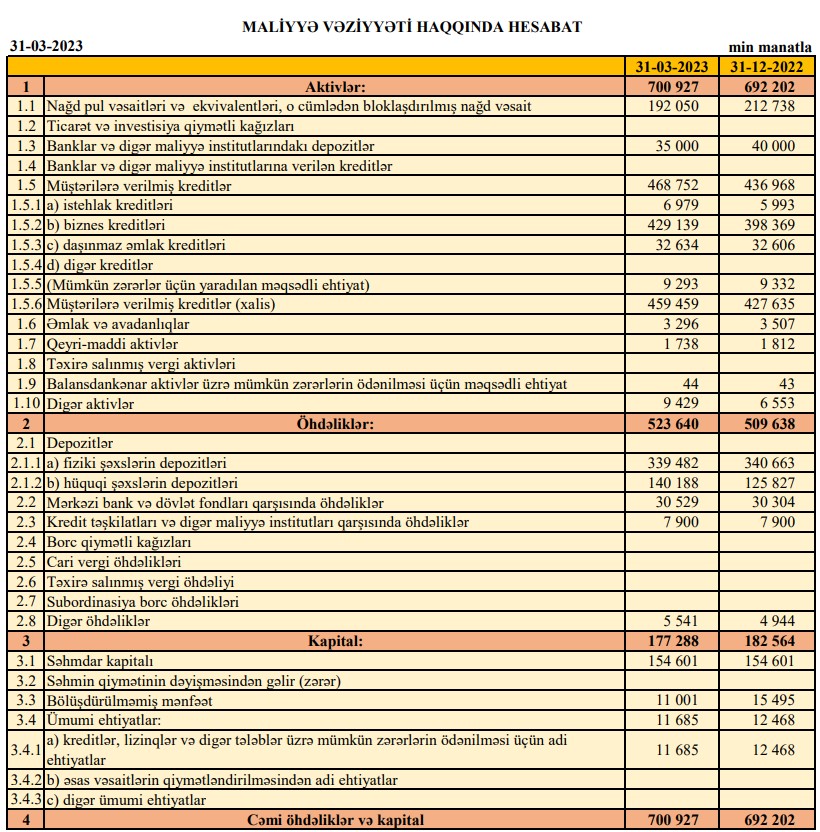 BANKIN AKTİVLƏRİ 700 MİLYON MANATI AŞIB