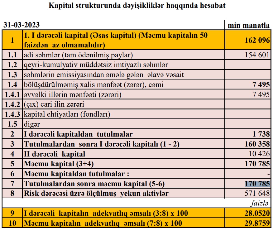 31 Mart 2023-cü il tarixində "Premium Bank" ASC 170 milyon 785 min manat məcmu kapitala malik olub. Bank ötən ilin sonunda 175 milyon 718 min manat məcmu kapitala malik idi.