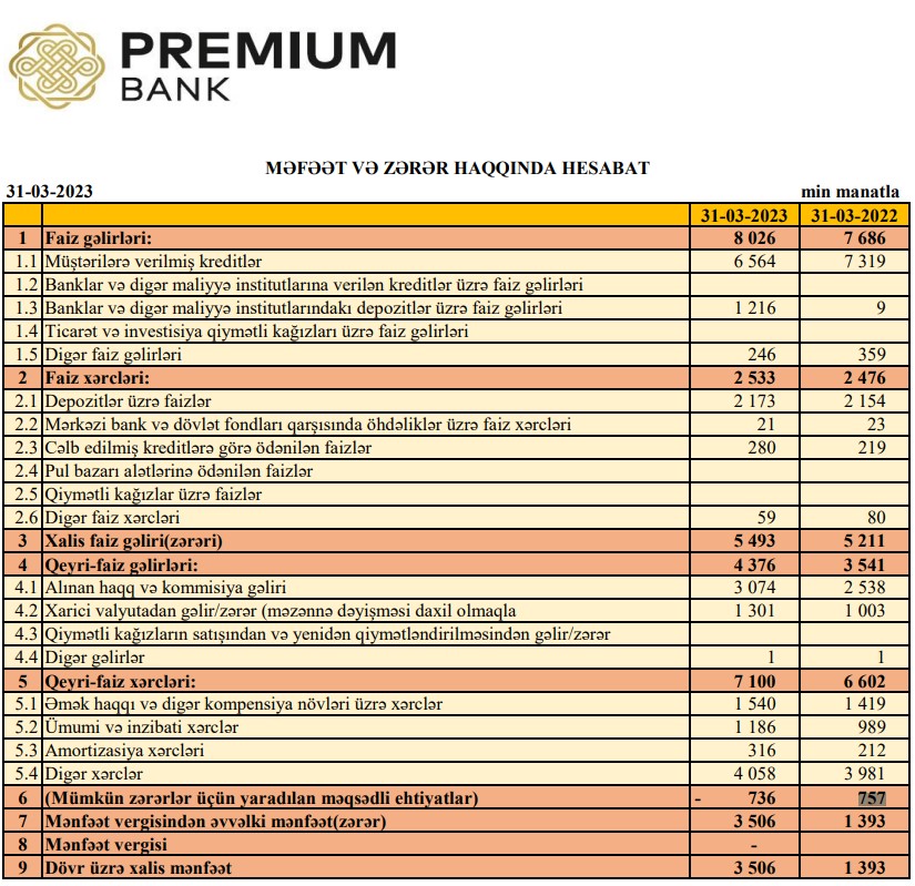 "Premium Bank" ASC 2023-cü ilin 1-ci rübünü (yanvar-mart) 3 milyon 506 min manat xalis mənfəət ilə başa vurub. Bank ötən ilin eyni dövrünü 1 milyon 393 min manat xalis mənfəət ilə bağlamışdı. Beləliklə, "Premium Bank"ın xalis mənfəəti 2022-ci ilin 1-ci rübü ilə müqayisədə 2023-cü ilin 1-ci rübündə 2,5 dəfə artıb. Xalis mənfəətin artması gəlirlərin artmasından və ehtiyatlardakı vəsaitdən mənfəətə əlavə edilməsindən qaynaqlanır.