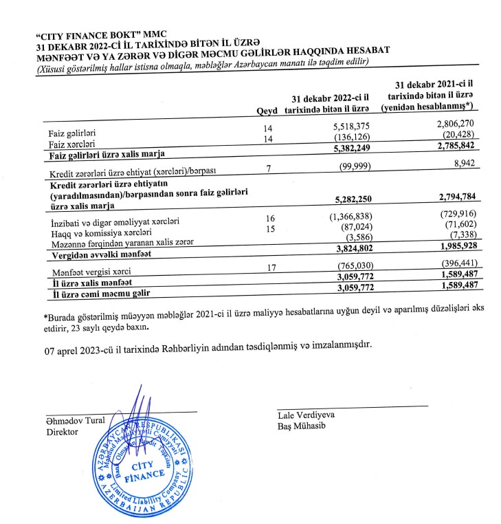 "City Finance BOKT" MMC 2022-ci ili 3 milyon 60 min manat xalis mənfəət ilə başa vurub. Təşkilat 2021-ci ili 1 milyon 589 min manat xalis mənfəət ilə bağlamışdı. Beləliklə, "City Finance BOKT"ın xalis mənfəti 2022-ci ildə 2021-ci illə müqayisədə 1 milyon 471 min manat və ya 92,6% artıb.