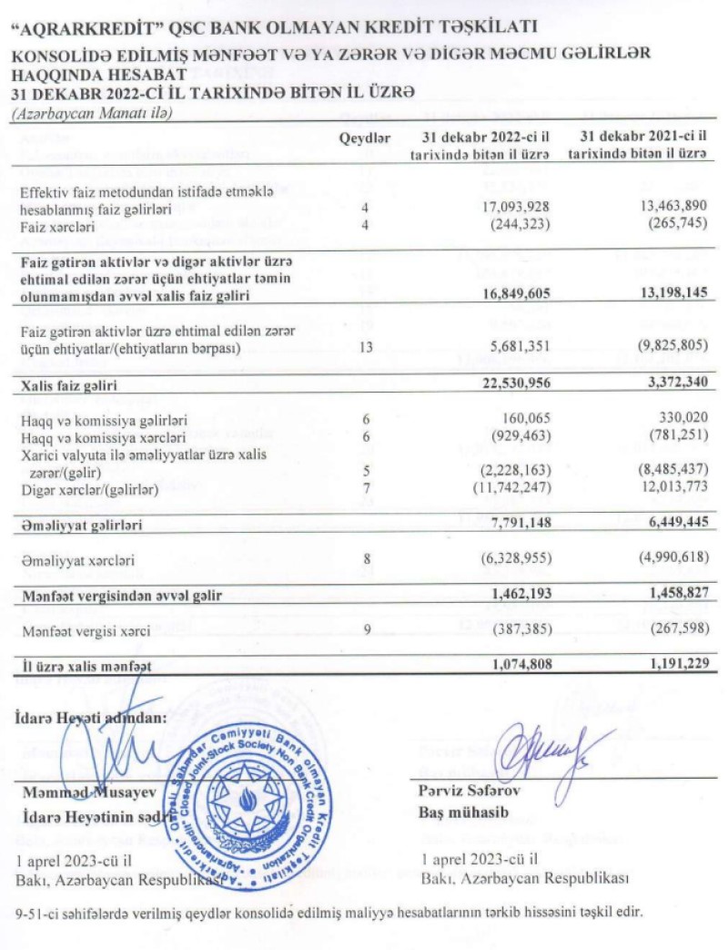 "Aqrarkredit" QSC Bank Olmayan Kredit Təşkilatı 2022-ci ili 1 milyon 75 min manat xalis mənfəət ilə başa vurub. Təşkilat 2021-ci ili 1 milyon 191 min manat xalis mənfəət ilə bağlamışdı. Beləliklə, ötən il "Aqrarkredit"in xalis mənfəəti 116 min manat və ya 9,8% azalıb. Xalis mənfəətin azalması əməliyyat və digər xərclərin artması ilə əlaqədardır.