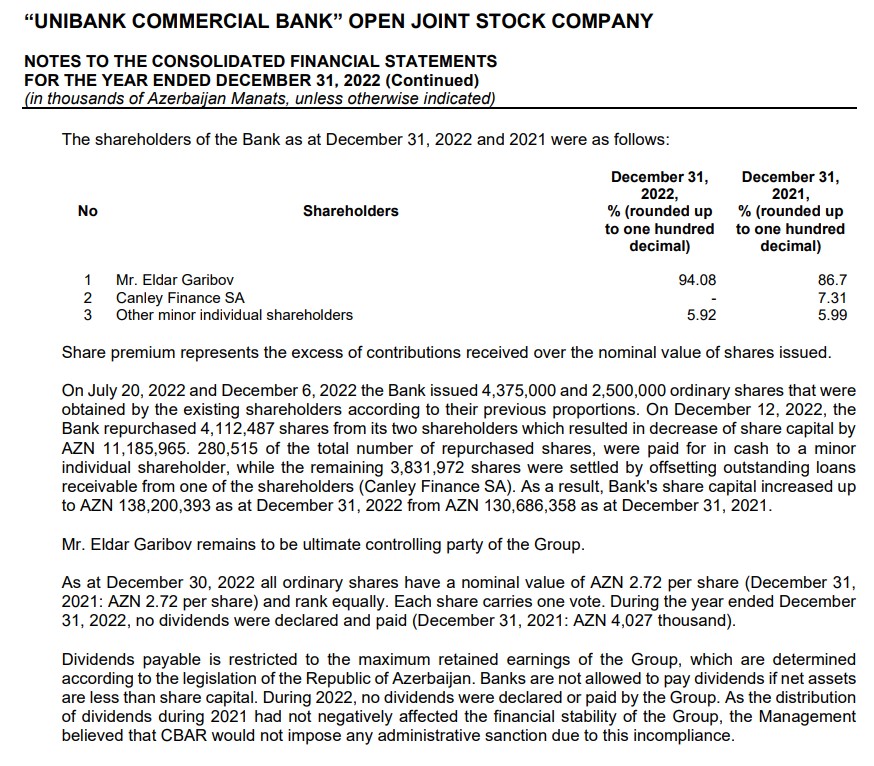Marja.az Bankın Audit olunmuş hesabatına istinadən xəbər verir ki, Lüksemburq şirkəti "Canley Finance SA" şirkəti "Unibank"ın nizamnamə kapitalındakı 7,31% payını əsas səhmdar Eldar Qəribova satıb. Nəticədə Qəribovun bankın nizamnamə kapitalındakı payı 86,7%-dən 94,08%-ə yüksəlib.