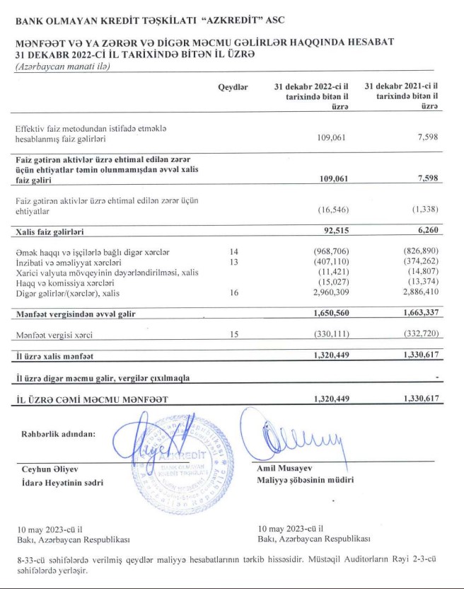 Ötən il "Azkredit" 2 milyon 960 min manat "digər gəlirlər" əldə edib (2021-ci ildə 2 milyon 886 min manat). Təşkilat digər gəlirlər hesabına xərclərini bağlayıb və xalis mənfəət əldə edib.