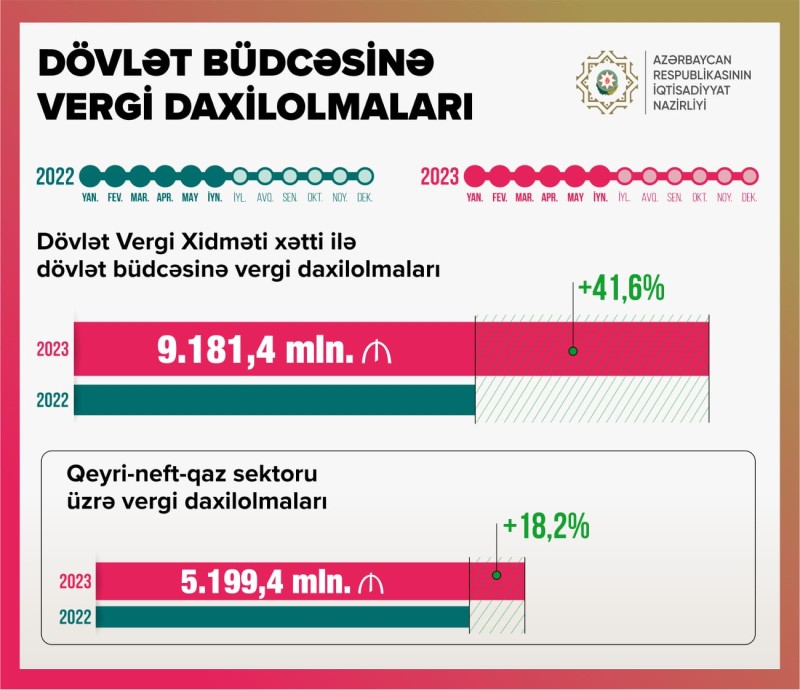 Bu müddətdə qeyri-neft-qaz sektorundan vergi daxilolmaları ötən ilin eyni dövrü ilə müqayisədə 18,2% artaraq 5 milyard 199,4 milyon manat olub.