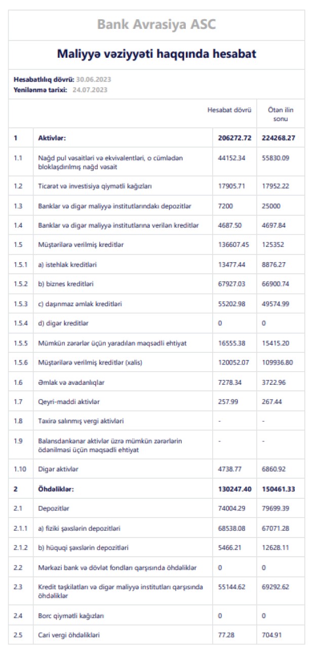 "Bank Avrasiya" ASC 2023-cü ilin birinci yarısını (yanvar-iyun) 2 milyon 273 manat xalis mənfəət ilə başa vurub. Bank ötən ilin eyni dövrünü 165 min manat xalis mənfəət ilə bağlamışdı. Beləliklə, 2023-cü ilin birinci yarısında 2022-ci ilin birinci yarısı ilə müqayisədə "Bank Avrasiya"nı xalis mənfəəti 2 milyon 108 min manat və ya 14 dəfəyə yaxın artıb. Artım faiz gəlirlərinin artmasından və mümkün zərərlər üçün yaradılan məqsədli ehtiyatlara daha az vəsait ayrılmasından qaynaqlanır.