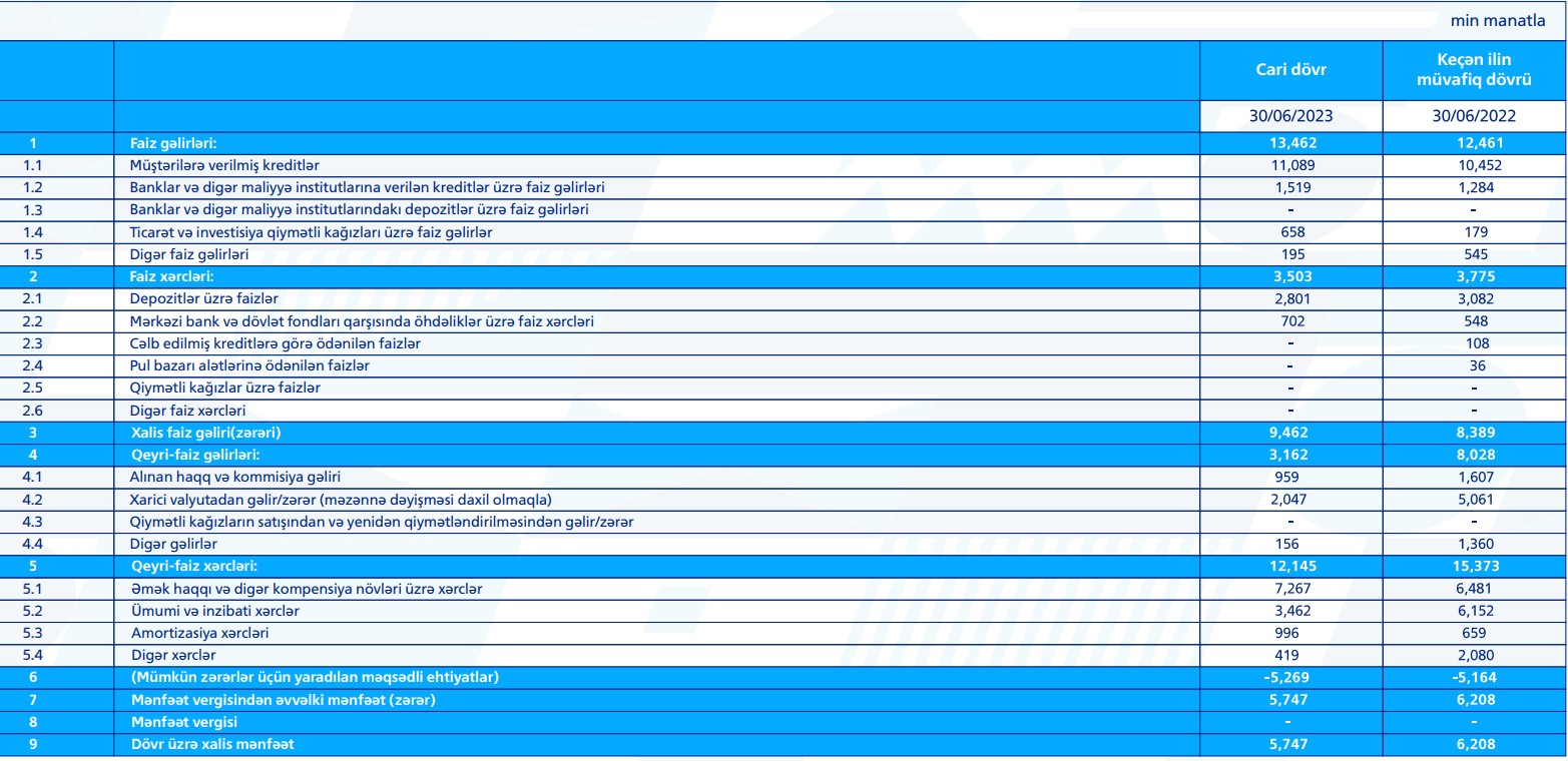 "Bank VTB Azərbaycan" ASC 2023-cü ilin birinci yarısını (yanvar-iyun) 5 milyon 747 min manat xalis mənfəət ilə başa vurub. Bank ötən ilin eyni dövrünü 6 milyon 208 min manat xalis mənfəət ilə bağlamışdı.