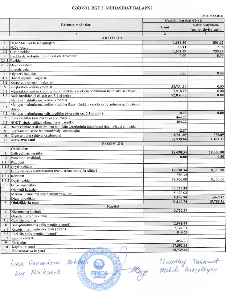 "Finca Azerbaijan" Qeyri-Bank Kredit Təşkilatı 2023-cü ilin birinci yarısını (yanvar-iyun) 840 min manat xalis mənfəət ilə başa vurub. Xatırladaq ki, Təşkilat 2022-ci ili 3 milyon 267 min manat, 2021-ci ili isə 2 milyon 611 min manat xalis mənfəət ilə bağlamışdı.