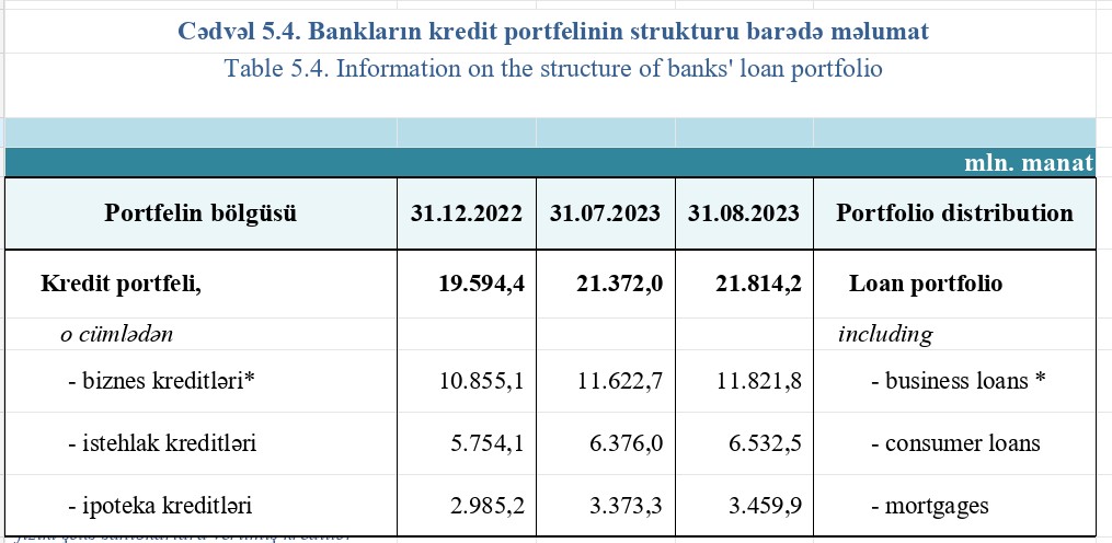 Avqust ayında bankların biznes kreditləri portfeli 199,1 milyon manat artaraq 11 milyard 821,7 milyon manata, istehlak kreditləri portfeli 156,5 milyon manat artaraq 6 milyard 532,5 milyon manata, ipoteka kreditləri portfeli isə 86,6 milyon manat artaraq 3 milyard 459,9 milyon manata çatıb.