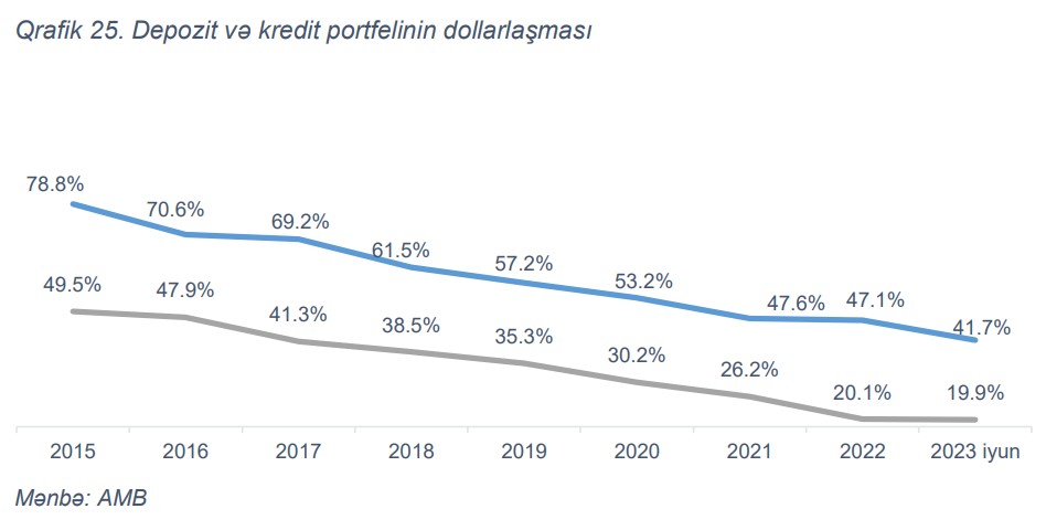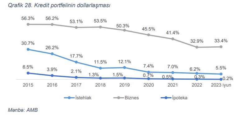 Qeyd edilib ki, 2022-ci ilin sonu ilə müqayisədə 2023-cü ilin birinci yarısında bankların kredit portfelinin dollarlaşması 0.2 faiz bəndi (f.b.) azalaraq 19.9% təşkil etmişdir. Azalmanın əsas drayveri istehlak kreditləri ollmuşdur. Belə ki, ilk yarımil ərzində istehlak kreditləri üzrə dollarlaşma səviyyəsi 0.7 f.b. azalaraq 5.5% təşkil etmişdir.