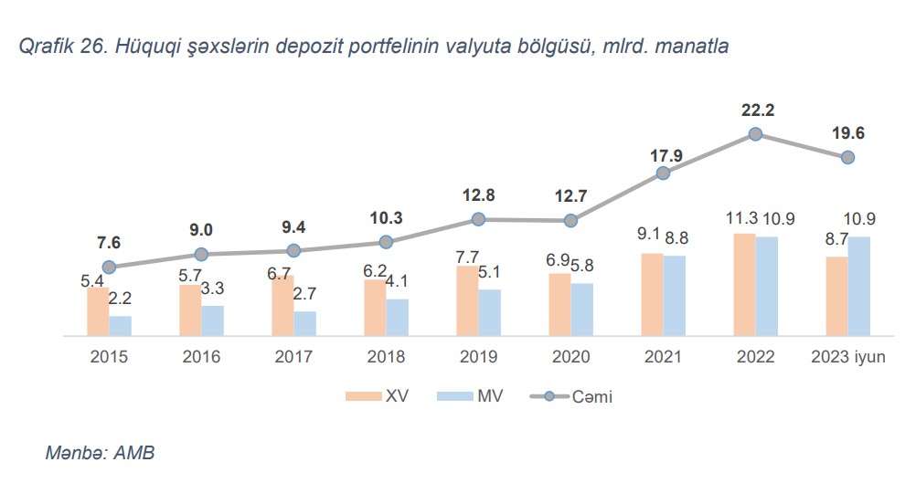 "Depozit portfeli üzrə de-dollarlaşmanın əsas drayveri hüquqi şəxslərin xarici valyutadakı tələbli depozitlərinin azalması olmuşdur. Son 6 ay ərzində hüquqi şəxslərin xarici valyutadakı tələbli depozitləri 3.1 mlrd. manat azalmışdır ki, bu da hüquqi şəxslər üzrə depozit portfelinin dollarlaşmasının 6.3 f.b. azalaraq 44.6%-ə enməsinə səbəb olmuşdur. Hüquqi şəxslərin müddətli depozitləri üzrə də uzunmüddətli de-dollarlaşma trendi davam etmişdir. Ötən ilin sonu ilə müqayisədə hüquqi şəxslərin müddətli depozitləri üzrə dollarlaşma səviyyəsi 2.4 f.b. azalaraq 67.7% təşkil etmişdir".