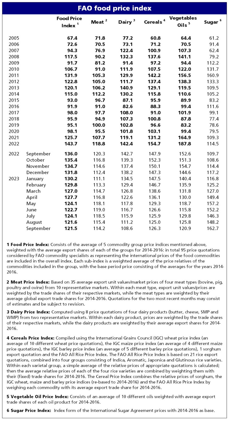 Birləşmiş Millətlər Təşkilatının Ərzaq və Kənd Təsərrüfatı Təşkilatı (FAO) qlobal ərzaq qiymətlərinin son iki ilin ən aşağı səviyyəsinə endikdən sonra sentyabr ayında dəyişməz qaldığını açıqlayıb. Ərzaq qiymətləri indeksi sentyabr ayında əvvəlki ayla müqayisədə 0,1 bənd azalaraq 121,5 bənd olub.Birləşmiş Millətlər Təşkilatının (BMT) Ərzaq və Kənd Təsərrüfatı Təşkilatı (FAO, ərzaq məhsullarının beynəlxalq qiymətlərində aylıq dəyişiklikləri izləyən FAO-nun Ərzaq Qiymətləri İndeksinin sentyabr ayında əvvəlki ayla müqayisədə 0,1 bənd azalaraq 121,5 bənd olduğunu açıqlayıb.