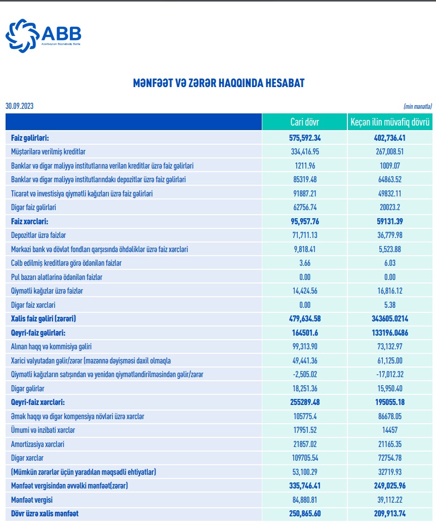 Aktivlərinin həcminə görə Azərbaycanda ən böyük bank olan "ABB" ASC (Azərbaycan Beynəlxalq Bankı) 2023-cü ilin 9 ayını (yanvar-sentyabr) 250 milyon 866 min manat xalis mənfəətlə başa vurub. Bank 2022-ci ilin 9 ayını 209 milyon 914 min manat xalis mənfəətlə bağlamışdı. Beləliklə, ABB-nin xalis mənfəəti 2023-cü ilin 9 ayında 2022-ci ilin eyni dövrü ilə müqayisədə 40 milyon 952 min manat və ya 19,5 % artıb. Xalis mənfəətin artması gəlirlərin artmasından qaynaqlanır.
