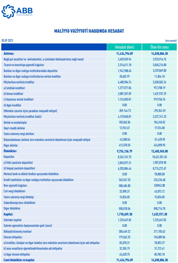 30 sentyabr 2023-cü il tarixində "ABB" ASC 11 milyard 434 min 796 min manat cəmi aktivlərə malik olub.