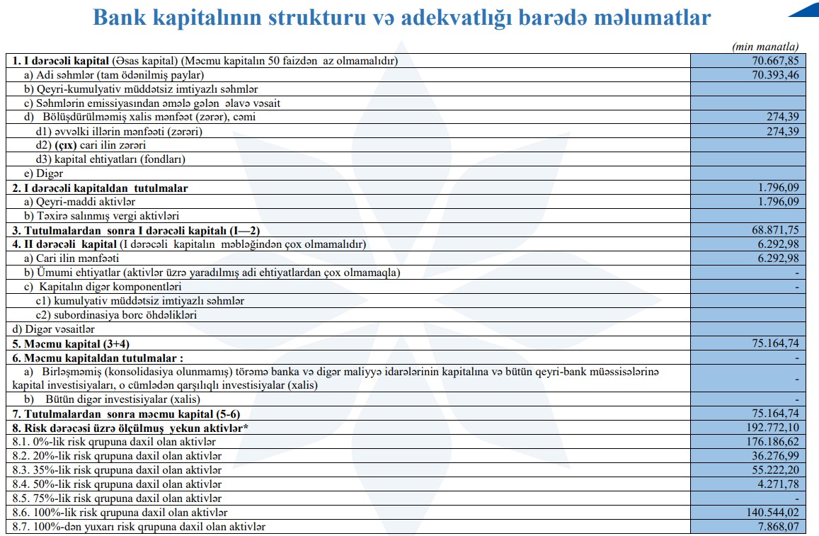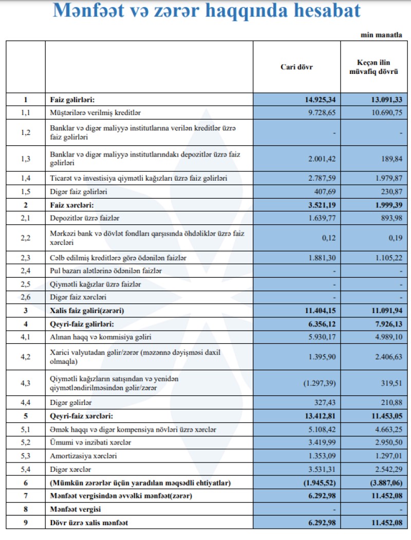 Ötən ilin 9 ayında Bankın cəmi əməliyyat gəlirləri 21 milyon 17 min manat, cəmi əməliyyat xərcləri 13 milyon 452 min manat, əməliyyat mənfəəti 7 milyon 565 min manat, mümkün zərərlər üçün yaradılan məqsədli ehtiyatlardan azad olmuş məbləğ 3 milyon 887 min manat təşkil etmişdi.