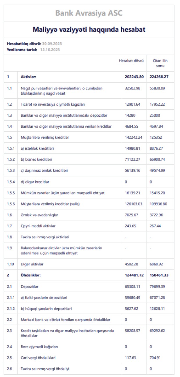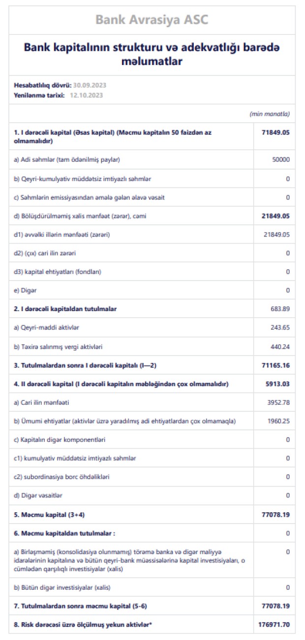 30 Sentaybr 2023-cü il tarixində "Bank Avrasiya"nın məcmu kapitalı 77 milyon 78 min manat təşkil edib