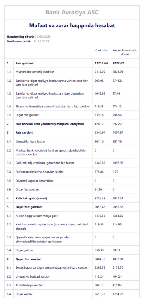 "Bank Avrasiya" ASC 2023-cü ilin 9 ayını 3 milyon 953 min manat xalis mənfəət ilə başa vurub. Bank ötən ilin eyni dövrünü 1 milyon 91 min manat xalis mənfəət ilə bağlamışdı. Beləliklə, 2023-cü ilin 9 ayında 2022-ci ilin eyni dövrü ilə müqayisədə "Bank Avrasiya" ASC-nin xalis mənfəəti 3,6 dəfə artıb. Xalis mənfəətin artması faiz gəlirlərinin artmasından və mümkün zərərlər üçün yaradılan məqsədli ehtiyatlara ayrılan vəsaitin azalmasından qaynaqlanır.