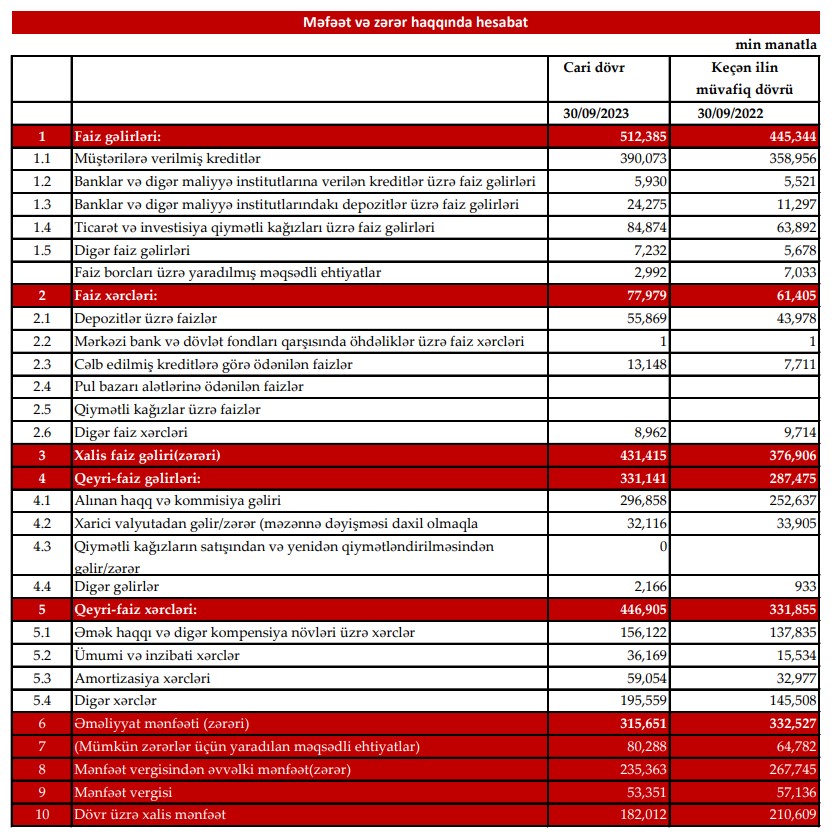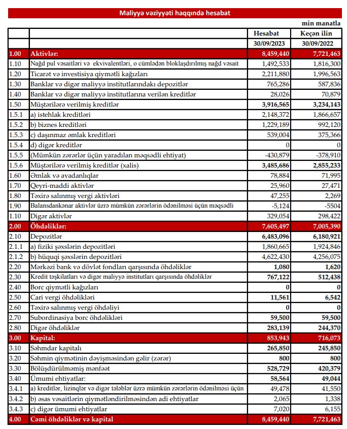 Bankın yaydığı press-relizdə bildirilir ki, 1 oktyabr 2023-cü il tarixinə olan nəticələrə görə bankda müştəri depozitlərinin həcmi 6.5 milyard manat təşkil edib.