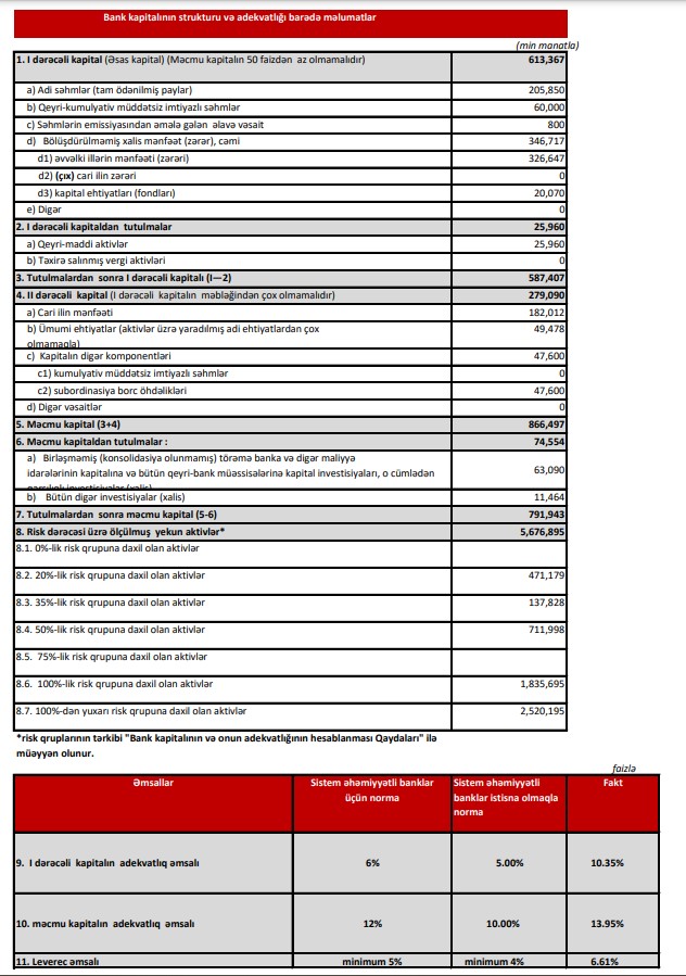Bankın 1 oktyabr 2023-cü il tarixinə tutulmalardan sonra məcmu kapitalı 792 milyon manat, adi və imtiyazlı səhmlər isə 265 milyon manatdır.