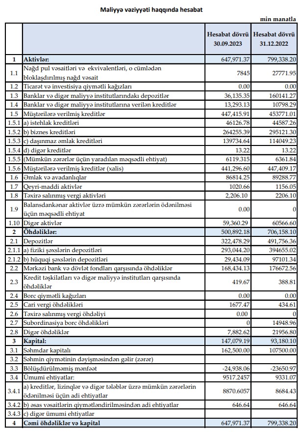 Marja.az-ın məlumatına görə, cəmi öhdəliklərin 322 milyon 478 min manatı cəmi depozitlər, o cümlədən 293 milyon 44 min manatı fiziki şəxslərin depozitləri, 29 milyon 434 min manatı hüquqi-şəxslərin (şirkətlərin) depozitləri olub. Mərkəzi Bank bəyan edib ki, 2023-cü ilin 3-cü rübünün sonuna Bank üzrə sığortalanmış (kompensasiya olunan) əmanətlər 216,7 milyon manat təşkil edir.