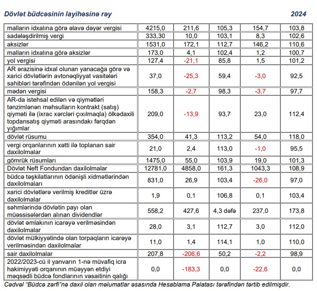 Marja.az xəbər verir ki, bu, Azərbaycan Respublikasının 2024-cü il dövlət büdcəsinin layihəsinə Azərbaycan Respublikası Hesablama Palatasının Rəyində bildirilir.