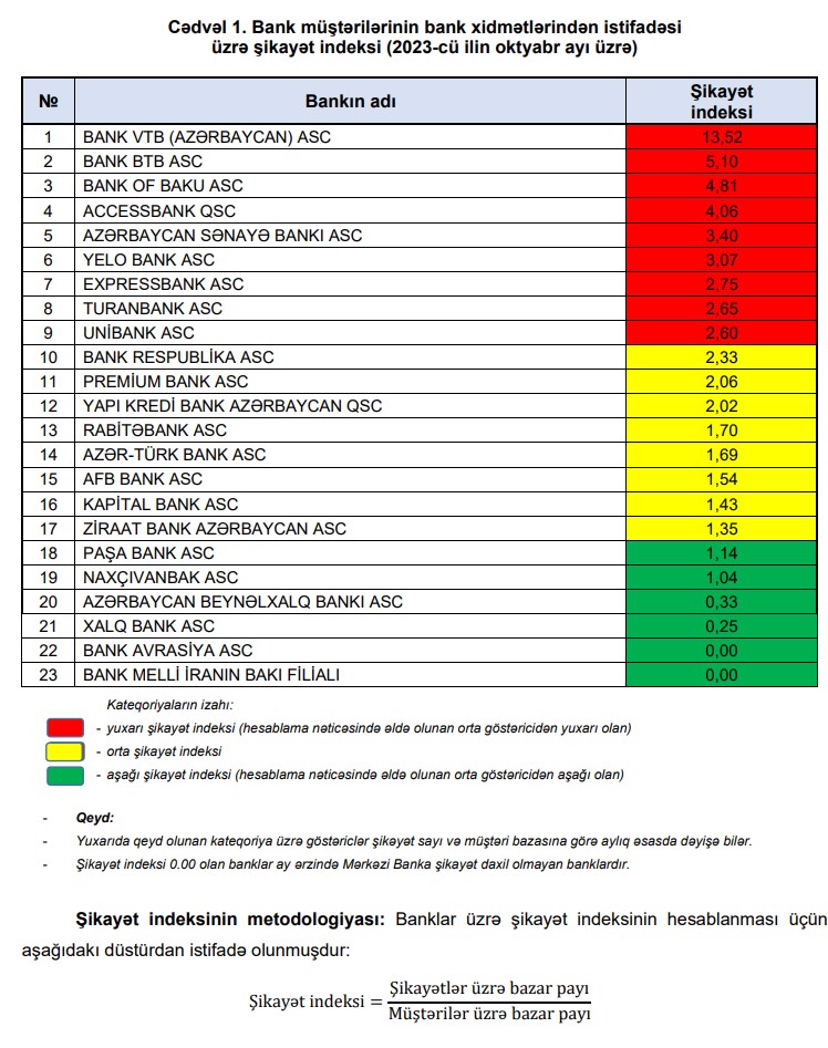 2023-cü ilin oktyabr ayına bank müştərilərinin bank xidmətlərindən istifadəsi üzrə şikayət indeksi və onun hesablama metodologiyası ilə bağlı məlumat: