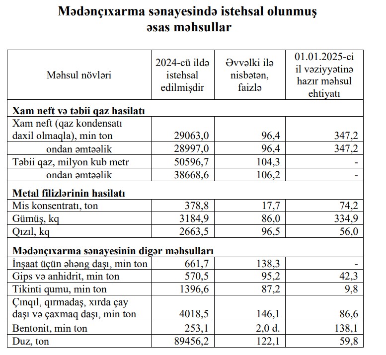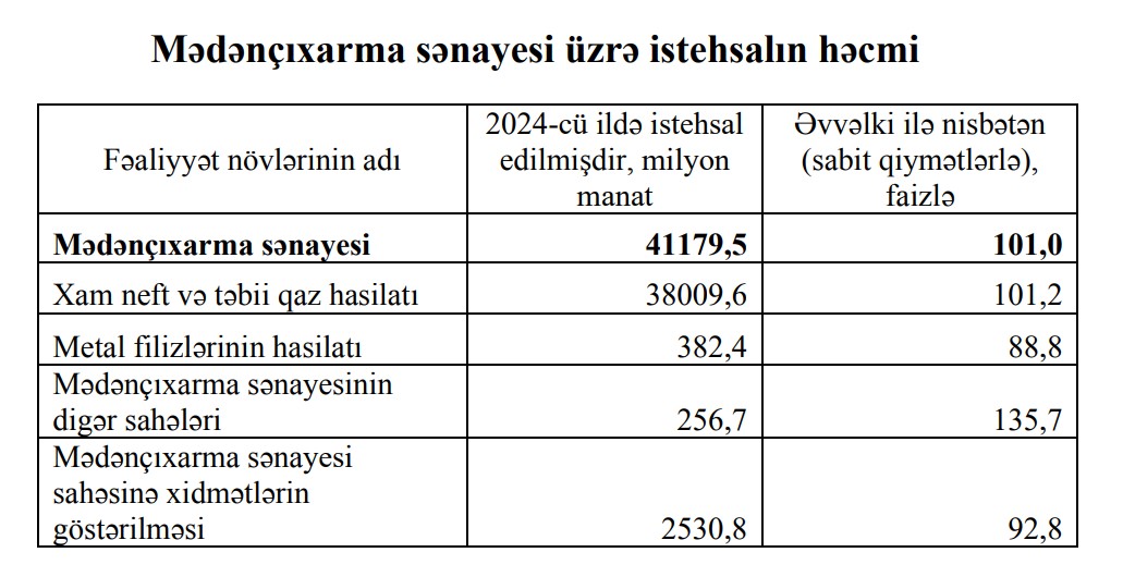 Mədənçıxarma sənayesində istehsalın ümumi dəyəri 41,2 milyard manat olmaqla, əvvəlki ilə nisbətən 1,0 faiz artmışdır