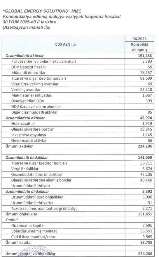 30 İyun 2025-ci il tarixində "Global Energy Solutions" 234 milyon 206 min manat cəmi aktivlərə malik olub.