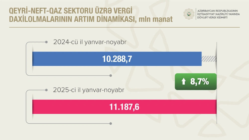 Vergilərin 73,1 faizi qeyri-neft-qaz sektorunun payına düşüb2025-ci ilin yanvar - noyabr aylarında İqtisadiyyat Nazirliyi yanında Dövlət Vergi Xidmətinin xəttilə dövlət büdcəsinə 15 milyard 310,5 milyon manat vergi daxil olub, proqnoza 105,1 faiz əməl edilib.