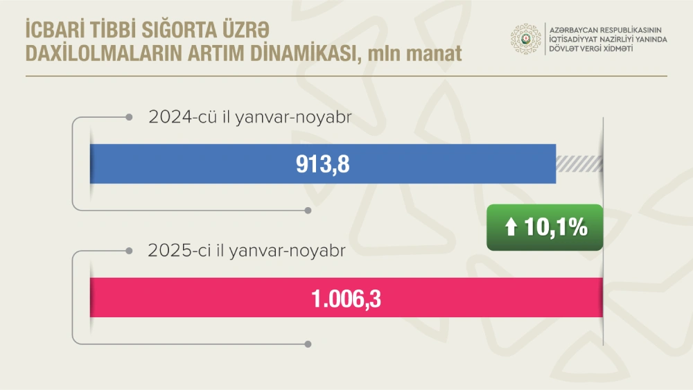 İcbari tibbi sığorta haqları üzrə daxilolmalar ötən ilin eyni dövrü ilə müqayisədə 10,1 faiz artaraq 1 milyard 6,3 milyon manat olub. Qeyri-büdcə təşkilatları üzrə daxilolmalar 9,6 faiz artıb və 713,7 milyon manat təşkil edib.