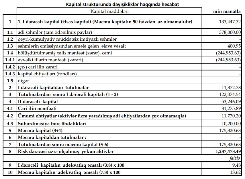 2025-ci ilin sonunda məcmu kapital 175 milyon 321 min manat təşkil edib ki, bu da 2024-cü ilin sonundakı 148 milyon 748 min manatla müqayisədə 26 milyon 573 min manat və ya 17,9 faiz artım deməkdir. Kapitalın artması bankın riskləri qarşılama qabiliyyətinin və tənzimləyici dayanıqlığının gücləndiyini göstərir.