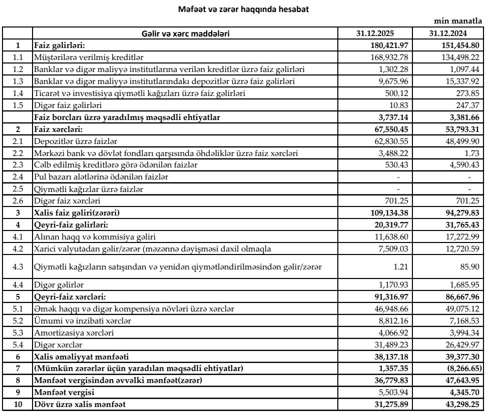 Daşınmaz əmlak (ipoteka) kreditləri portfeli isə 2025-ci ilin sonuna 98 milyon 90 min manat təşkil edib ki, bu da 2024-cü ilin sonundakı 84 milyon 268 min manatla müqayisədə 13 milyon 822 min manat və ya 16,4 faiz artım anlamına gəlir. İpoteka portfelindəki yüksəliş bankın uzunmüddətli kreditləşmə alətlərinə marağın artmasından faydalandığını göstərir.
