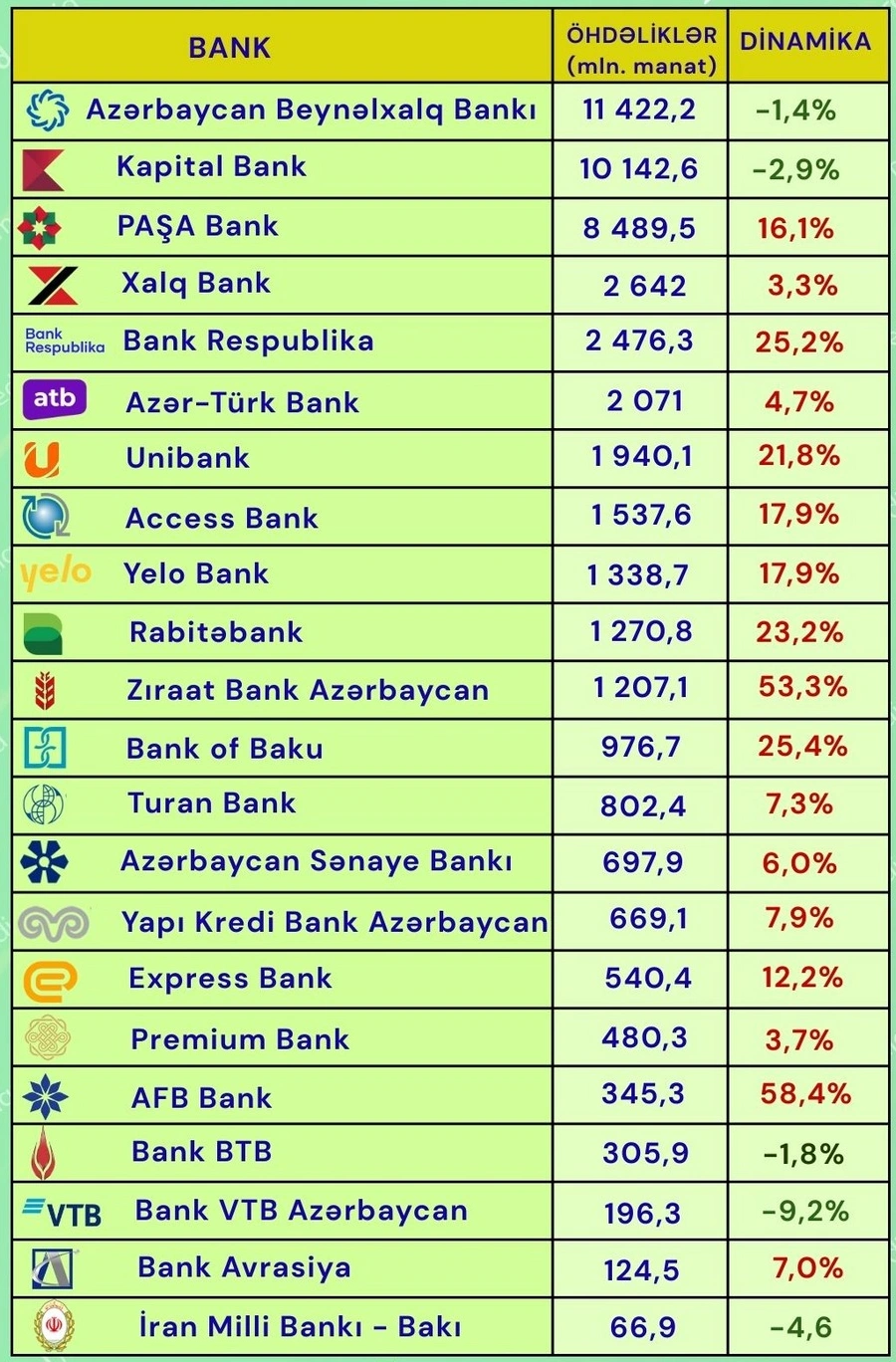 Bunlar, “Azərbaycan Beynəlxalq Bankı” (11 milyard 422,2 milyon manat), “Kapital Bank” (10 milyard 142,6 milyon manat), “PAŞA Bank” (8 milyard 489,5 milyon manat), “Xalq Bank” (2 milyard 642 milyon manat) və “Bank Respublika”dır (2 milyard 476,3 milyon manat).