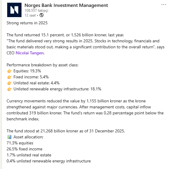 “2025-ci ildə fond çox yüksək nəticələr göstərdi. Texnologiya, maliyyə və xammal sahəsindəki səhmlər ümumi fonda nisbətən fərqlənərək ümumi gəlirliliyə mühüm töhfə verdi”, — deyə Norges Bank Investment Management-in baş icraçı direktoru Nikolay Tangen bildirib.