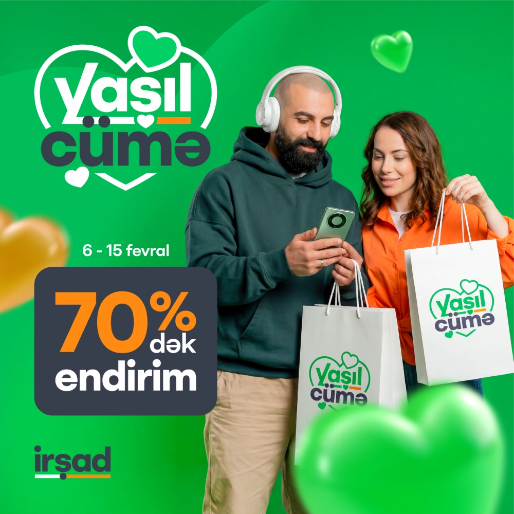 Yaşıl Cümə” kampaniyası çərçivəsində İrşad mağazalar şəbəkəsində və onlayn satış platformalarında ev və şəxsi istifadə üçün elektronika, məişət texnikası, mebel, smartfonlar və aksessuarlar 70%-ə qədər endirimlə təqdim edilir.