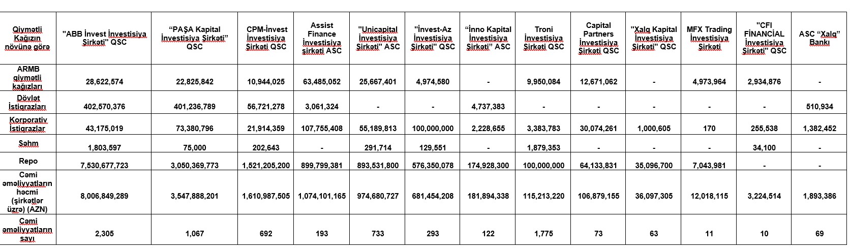 Marja.az Birjaya istinadən xəbər verir ki, "ABB İnvest İnvestisiya Şirkəti" QSC 8 milyard 6 milyon 849 min manat əməliyyat həcmilə 1-ci yeri tutub.