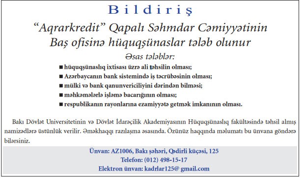 BOKT-dan verilən məlumata görə, işə götürüləcək şəxslər “Azərbaycan Beynəlxalq Bankı” ASC-dən (ABB) qəbul edilmiş problemli kreditlərin yığılması ilə məşğul olacaq.
