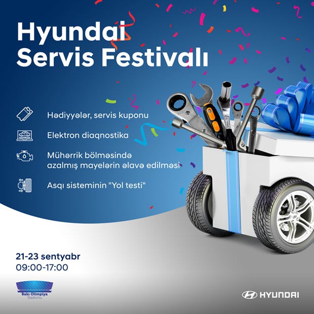 (®) “Hyundai Motors” şirkətinin Azərbaycanda rəsmi idxalçısı “Auto Azərbaycan” şirkəti Hyundai avtomobili sahiblərini 21, 22, 23 Sentyabr tarixlərində Bakıda, Olimpiya Stadionunun ərazisində baş tutacaq növbəti Hyundai Servis Festivalına dəvət edir.