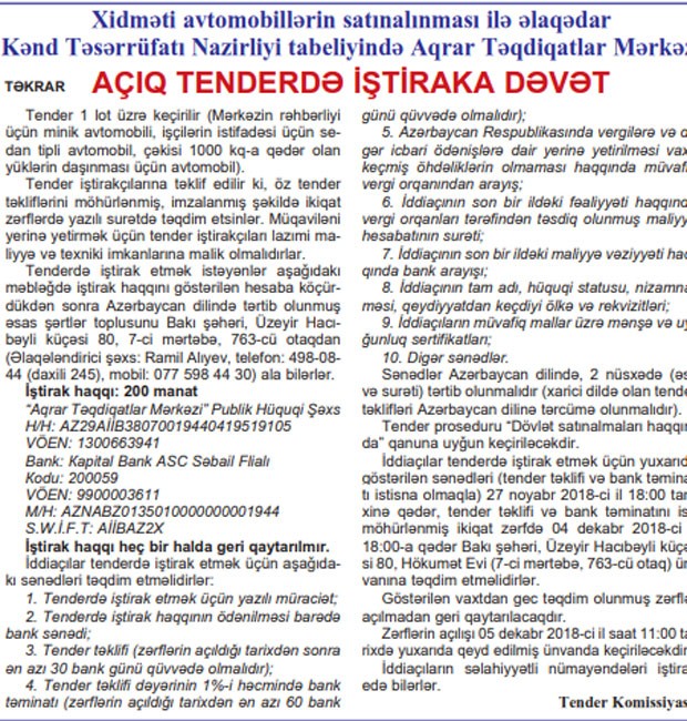 Kənd Təsərrüfatı Nazirliyi Tabeliyində Aqrar Tədiqiqatlar Mərkəzi xidməti avtomobillərin satın alınması ilə əlaqədar açıq tender elan edib.