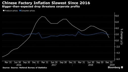 Çin Statistika Bürosu tərəfindən verilən açıqlamaya görə, istehlakçı qiymətləri indeksi kəskin geriləyərək Dekabrda əvvəlki ilin eyni dövrü ilə müqayisədə 1.9 faiz artıb. Proqnozlar inflyasiyanın 2.1 faiz olacağı istiqamətində idi. İstehsalçı qiymətləri isə 1.6% olan proqnozdan aşağı qalaraq 0.9 artıb.