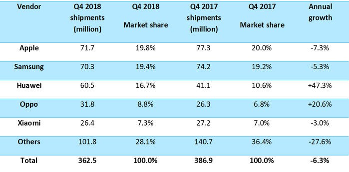 "Samsung"un ağıllı telefon satışları 2018-ci ildə 7.2 faiz azalaraq 293.7 milyona, "Apple"ın satışları isə 1.7 faiz azalma ilə 212.1 milyon ədədə geriləyib. Çinin "Huawei" və "Xiaomi" şirkətləri isə illik satışlarını müvafiq olaraq 34.5 faiz və 31.6 faiz artırıb.