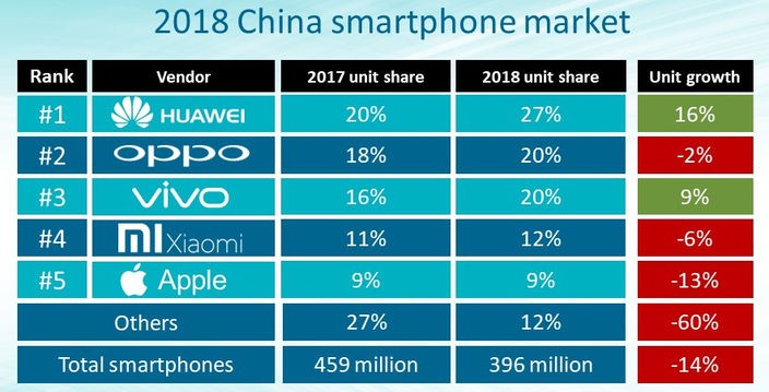 2018-ci ili "ticarət müharibələrinin" kölgəsində keçirən ağıllı telefon bazarında satışlar geriləməyə davam edib. Bazardakı tənəzzül ardıcıl 5 rüb davam edib. "Samsung"un satışları 7.2 faiz, "Apple"ın satışları isə 1.7 faiz azalıb. Çinin "Huawei" və "Oppo" şirkətləri isə qlobal satışlarını 30%-dən çox artırıb.