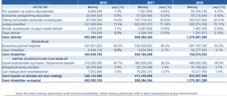 31 Dekabr 2018-ci il tarixində Fond 1 milyard 277 milyon manat cəmi aktivlərə və 895 milyon 274 min manat ipoteka kreditləri portfelinə malik olub. 31 Dekabr 2017-ci il tarixində Fond 958 milyon 384 min manat cəmi aktivlərə və 683 milyon 691 min manat ipoteka kreditləri portfelinə malik idi.