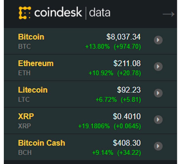 Bakı vaxtı ilə saat 10:30-da Bitcoin-in qiyməti 13,80 faiz artımla 8037 dollar təşkil edib.