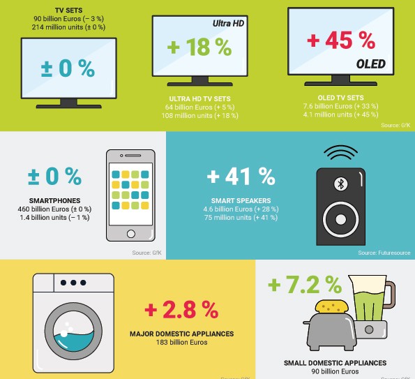 Analitika şirkəti GfK-nın məlumatlarına görə, cəmi 1 trilyon 52 milyard avro olaraq proqnozlaşdırılan istehlakçı elektronikası məhsullarının satış dövriyyəsi bu il 1 faiz artacaq. Bu rəqəmin 267 milyard avrosu Avropa bölgəsinin, 440 milyard avrosu Asiya-Pasifik bölgəsinin, 208 milyard avrosu Şimal Amerika və 70 milyard avrosu da Cənub Amerika bölgəsinin hesabına formalaşacaq.