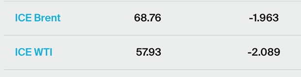 "Marja" xəbər verir ki, Brent neftinin qiyməti 2% ucuzlaşma ilə 68,76 dollara, ABŞ xam neftinin qiyməti isə 2,1% geriləmə isə 57,93 dollara düşüb (Bakı vaxtı ilə saat 14:35-ə olan məlumat).