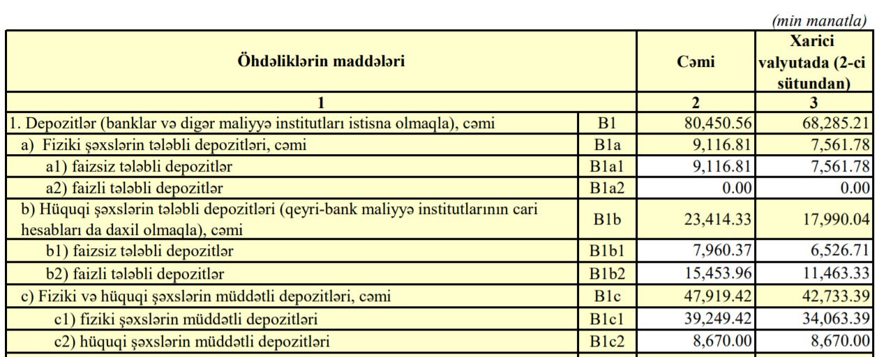Cəmi depozitlərin 12 milyon 528 min manatını fiziki şəxslərin tələbli depozitləri, 16 milyon 383 min manatını hüquqi şəxslərin tələbli depozitləri, 50 milyon 420 min manatını fiziki və hüquqi şəxslərin müddətli depozitləri təşkil edib.