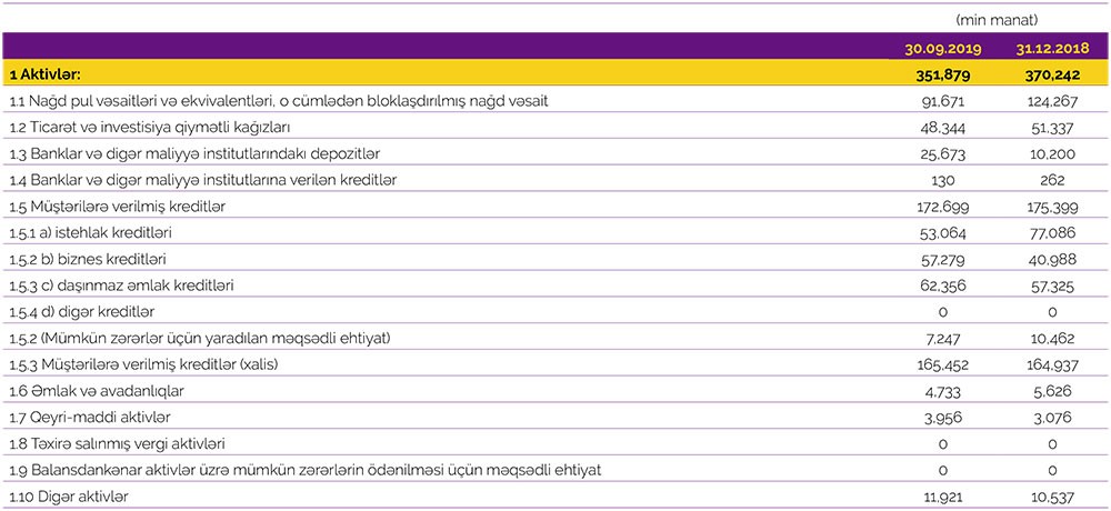 30 Sentyabr 2019-cu il tarixində “Azər-Türk Bank” 351 milyon 879 min manat cəmi aktivlərə malik olub, aktivlərin 172 milyon 699 min manatını müştərilərə verilmiş kreditlər təşkil edib. 2018-ci ilin sonunda “Azər-Türk Bank”ın cəmi aktivləri 370 milyon 242 min manata və müştərilərə verilən kreditlər 175 milyon 399 min manata bərabər idi. “Azər-Türk Bank” banklar və digər maliyyə institutlarındakı depozitlərini 15 milyon 473 min manat artıraraq 25 milyon 673 min manata çatdırıb.