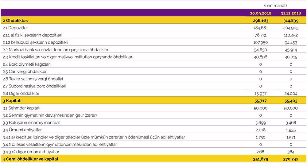 Müqayisə üçün qeyd edək ki, 2018-ci ilin yanvar-sentyabr dövründə “AzərTürk Bank”ın cəmi gəlirləri 20 milyon 428 min manat, cəmi xərcləri 21 milyon 597 min manat və nəticədə 1 milyon 169 min manat əməliyyat zərəri yaranmışdı. Mümkün zərərlər üçün yaradılmış xüsusi ehtiyatdan 1 milyon 289 min manatın azad olması hesabına Bank əməliyyat zərərini bağlamış və 120 min manta xalis mənfəət təmin etmişdi.
