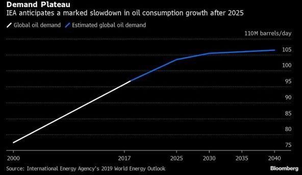 Beynəlxalq Enerji Agentliyinin (UEA) Dünya Enerji Proqnozları hesabatında yer verilən təxmininə görə, qlobal neft tələbinin artması 2030-cu illərdə demək olar ki, dayanacaq.